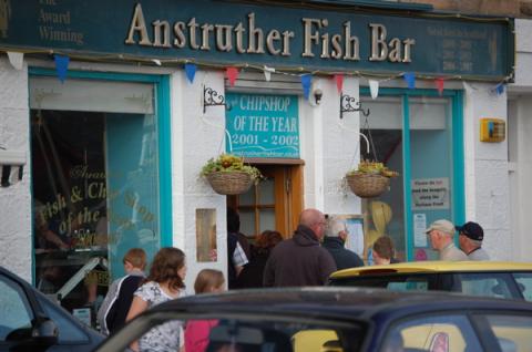 Food for thought...The Scots still haven't quite caught onto the dining out thing, although all evidence is that the food in Scotland is way better than it is alleged to have been just a few years ago.  We queued up for fish and chips at the legendaryanstrutherqueue.jpg Anstruther Fish Bar in the town of the same name.  After an hour wait, the sodden little piece of fish served in a cardboard box (inside the restaurant) and the mediocre fries (chips) would hardly pass muster at Long John Silver's.  We found it was best to keep it simple when it came to ordering out, as in a nice cheese plate at the Bean Scene; or ethnic, as in the good Thai restaurant we dined at in St. Andrews.  That was probably our best meal of the entire week in Scotland, save for the Peat Inn, which I reviewed here a few days ago and which cost essentially a month of house payments.  Actually, come to think of it, one of the best dishes of my week was the chicken tikka masala, an Indian dish I ordered, with some trepidation, in the Scotscraig Golf Club clubhouse.  It was excellent, perhaps as much for the meals I had eaten in the days before as for its own inherent good taste.