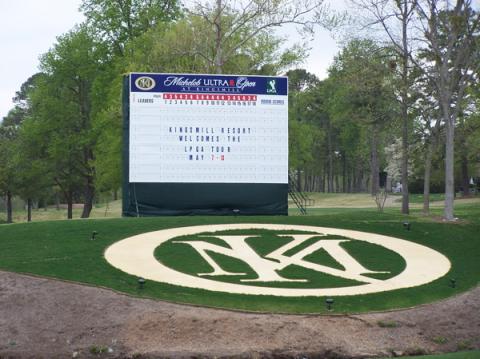 Kingsmill's River Course is 30 years old and is the best known of the three - the other two are the Plantation and the Woods.  Pete Dye reworked his own River Course design four years ago at a cost of about $5 million, all paid for by the resort with no assessment to members.  The men's tees play to a mild 6,325kingsmilllpgawelcome_sign.jpg yards with a rating of 70.9 and slope of 133. (Note:  I probably picked up an old yardage book which indicated a rating of 71.9 and slope of 138, quite a difference from what I saw.)  Dye softened up the course to come more in line with its resort function as well as the switch from a PGA to an LPGA venue.  In its previous design, the course had hosted a PGA tour event for 22 years.  The ladies at the LPGA event this year are playing from 6,300 yards.