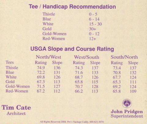 That could explain why the Calabash, NC, version of the Thistle Club has touted itself as "ferocious but fair."  Designed by the hot Tim Cate, whose laudable if peculiar predisposition is to work on only one course at a time (Mr. Nicklaus take note), the 27-hole Thistle is thought by frequent players in these parts to be the best golf course between Myrtle Beach and Wilmington.  At its longest routing of 7,000 yards, the three 18-hole combinations play to a maximum rating of 74.9 and slope of 137.  The tees for the rest of us, at around 6,400, drop the average ratings to around 71.5 and slope to an average 132, a stern enough test for, say, a 12-handicap player.  The Thistle features most of the characteristics of other coastal courses, but with conditioning (especially the large greens) that are consistently praised by those who know the course.  Native coastal grasses, large sand bunkers and a number of lakes dominate the landscape.  The fairways are more lush than links like and sweep up Cate's man-made berms toward hollows and bunkers.