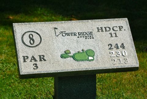 Tower Ridge hugs the Farmington River at one point and had been hit pretty hard by the remnant rains from Hurricanes Irene and Lee. Some holes had been shortened significantly and cart traffic patterns were diverted as the course dried out. But the titanic 8th hole was unaffected since it plays along the midpoint on the side of the mountain, between an elevated tee and a long deep green 235 yards out and about six stories down. Such an elevated tee on a par 4 or par 5 is a welcome sight since it adds 20 or 30 or more yards to a well-struck drive; but on a par 3, it wreaks havoc with club selection. (How did my high school geometry teacher say you figure out the hypotenuse of the isosceles triangle?) The pin on the day I played was just a couple of strides from the back edge of the deep green, and I knew I could not get a 4-wood back there.